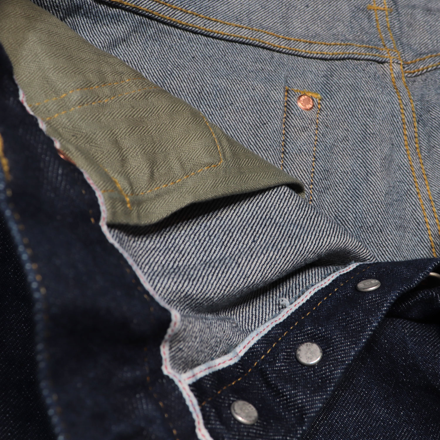 コインポケットのリベット、股下リベットも排除し、ポケットのスレーキはヘリンボーン素材を使用。