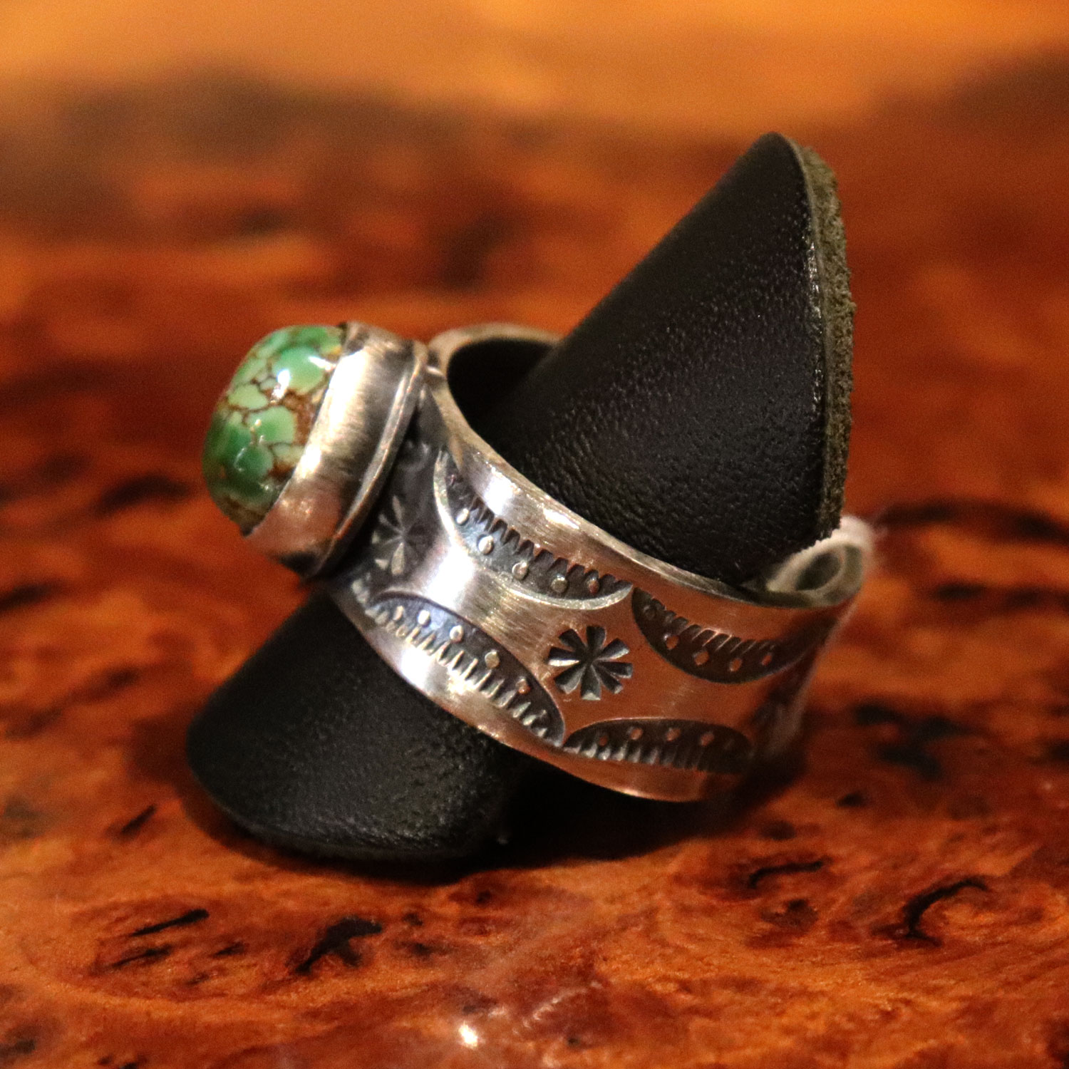 深みのある濃淡の抹茶色のターコイズに、程よく茶色のマトリックスがバランスよく入ったターコイズリング。