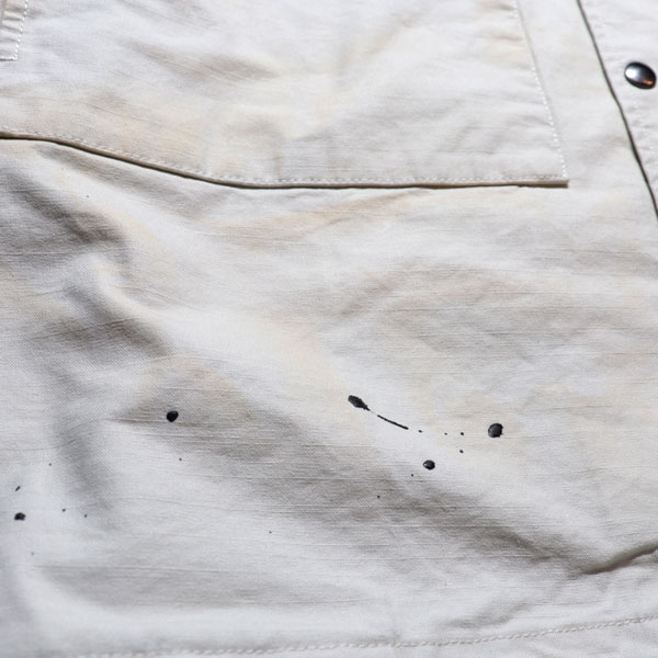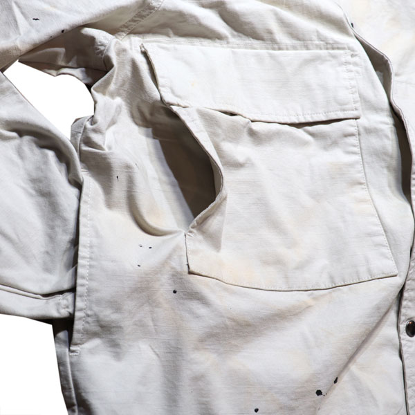 ただのハンティングジャケットではなく、着古した風合いを再現したヴィンテージ加工に加え、ペイントを飛ばした加工まで施したこだわりのジャケット。