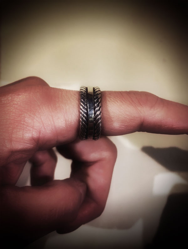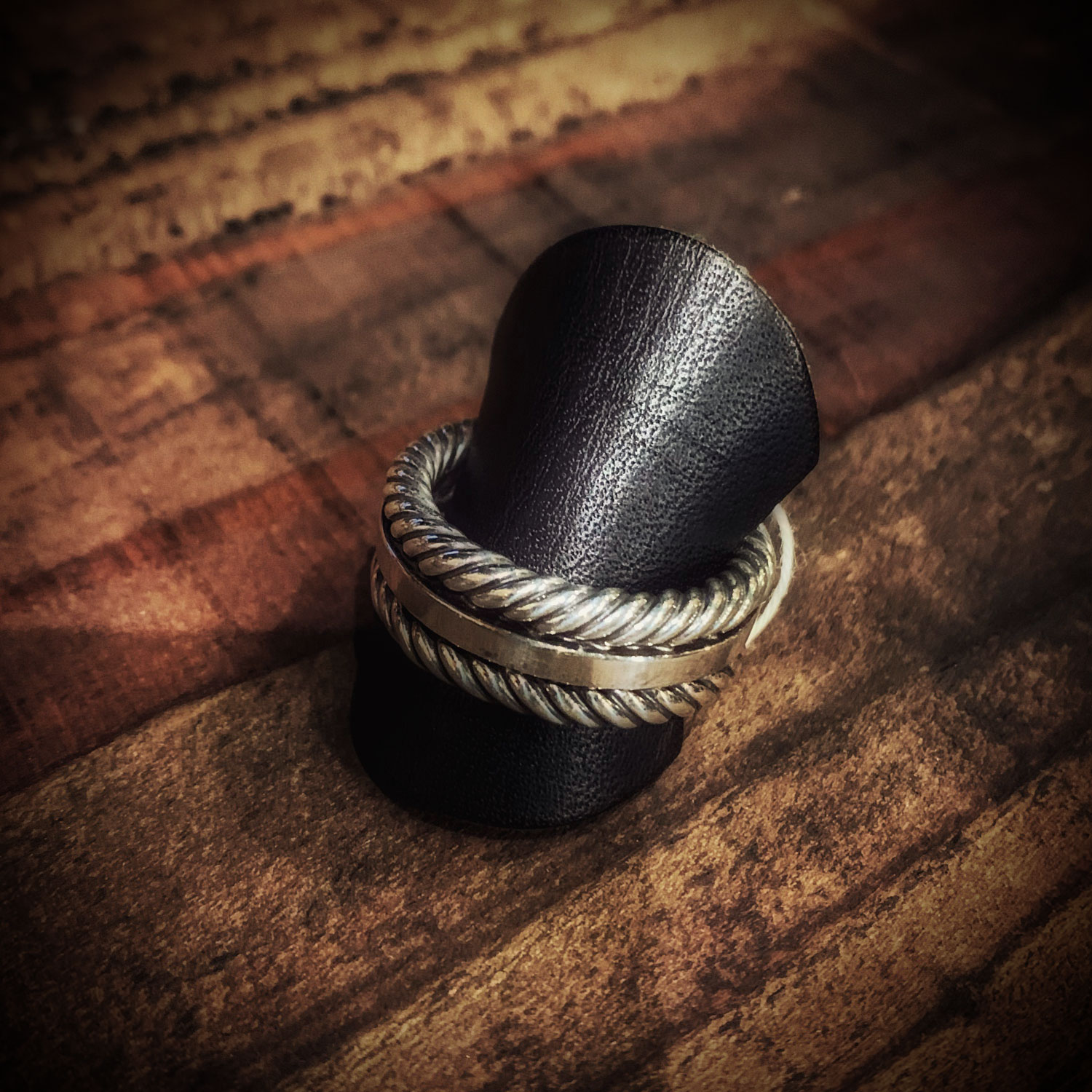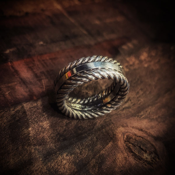 ワイヤーワークで製作されたシンプルなデザインですが、外側の捻じれたデザインにより、目の錯覚で片側が細く見えるトリッキーなリング。