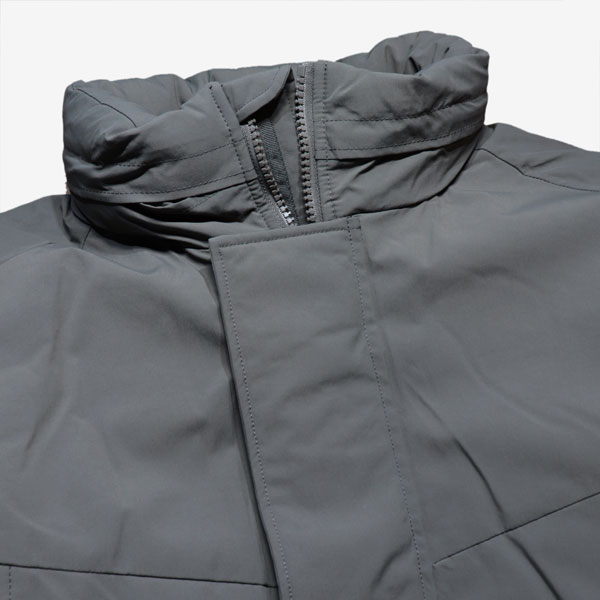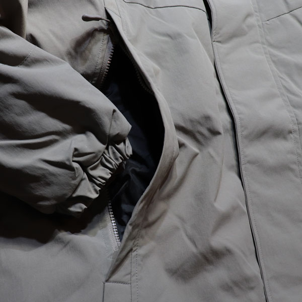 スタンドカラーにはフードが収納されており、機能性に優れた仕様。