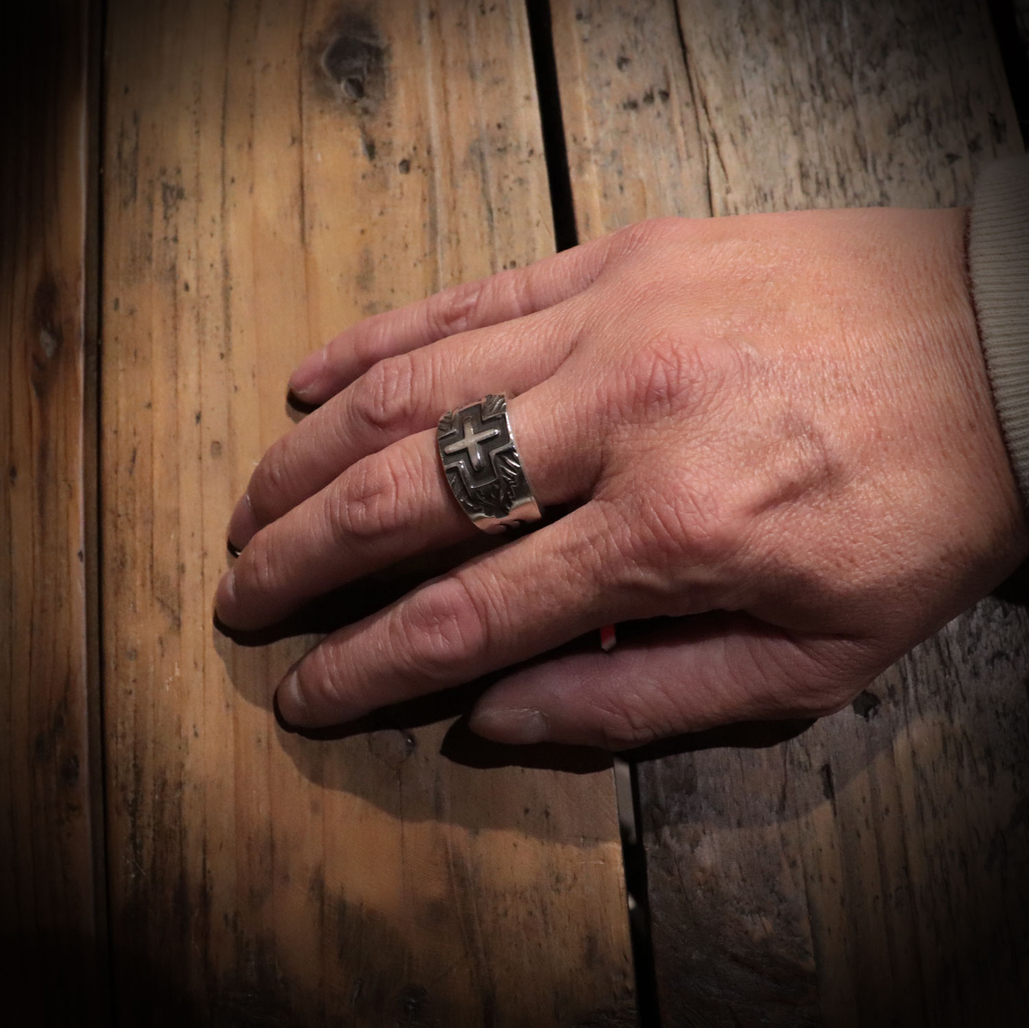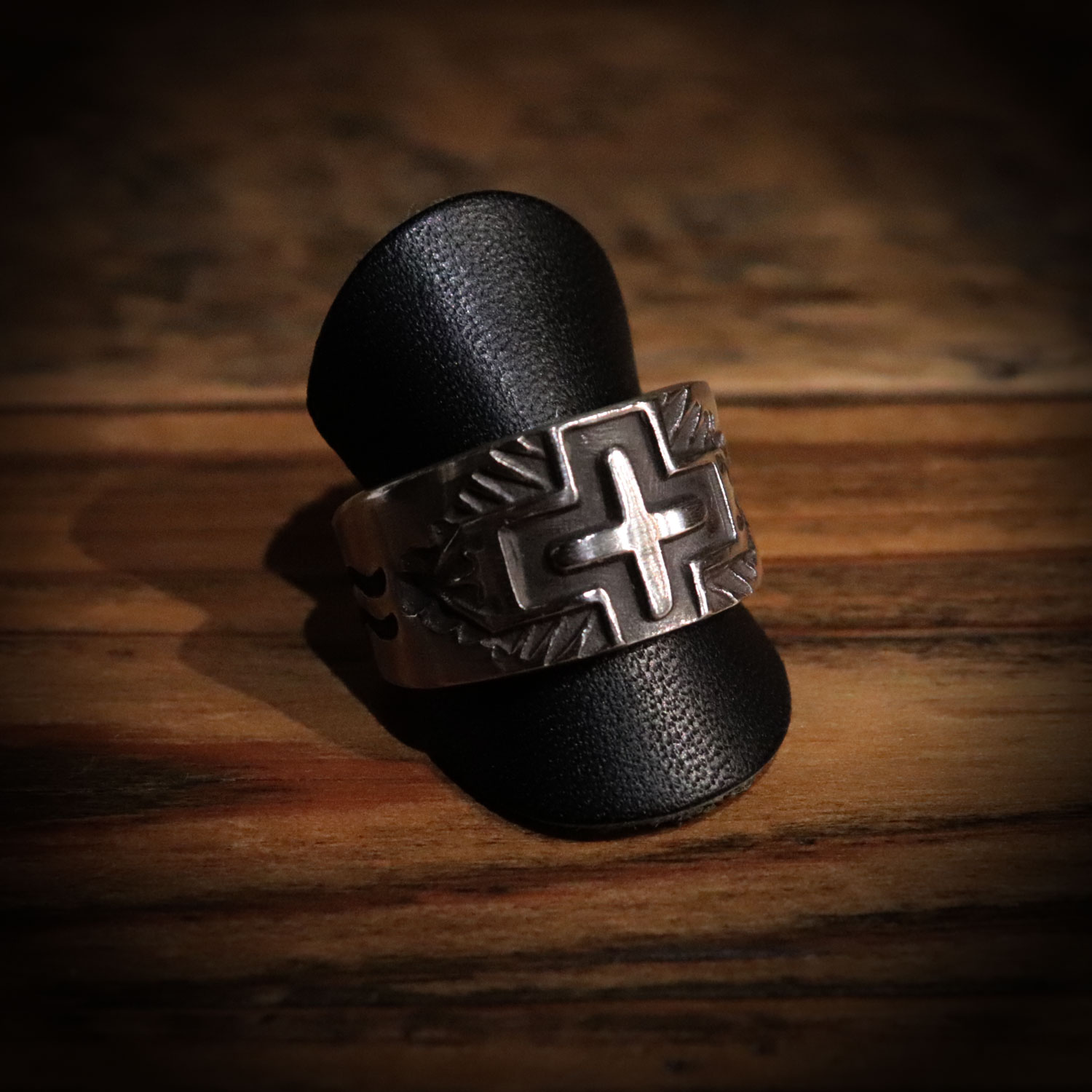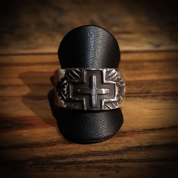 ヘビーゲージのシルバーに、深く刻まれたクロススタンプが力強い作品。